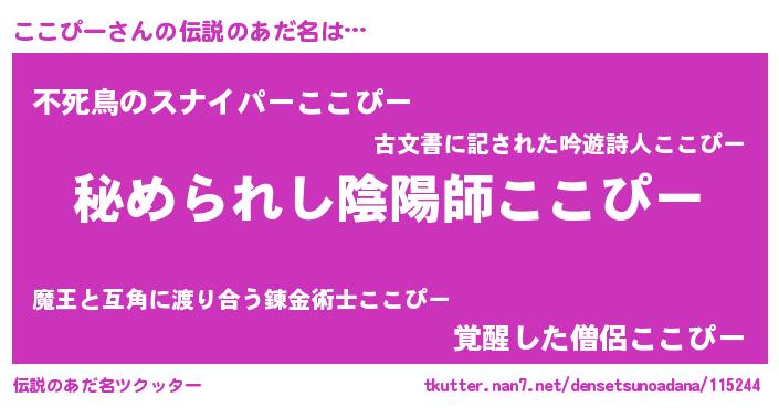 | ヒーロー風カッコイイあだ名 | 『ウルトラここぴーマン』『幻影騎士ココ』 |