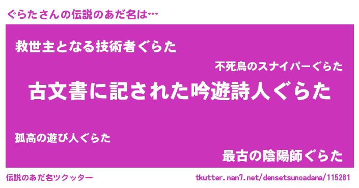 | 意味不明あだ名 | 『ニラ科ぐらた属』『自称ぐらた』 |