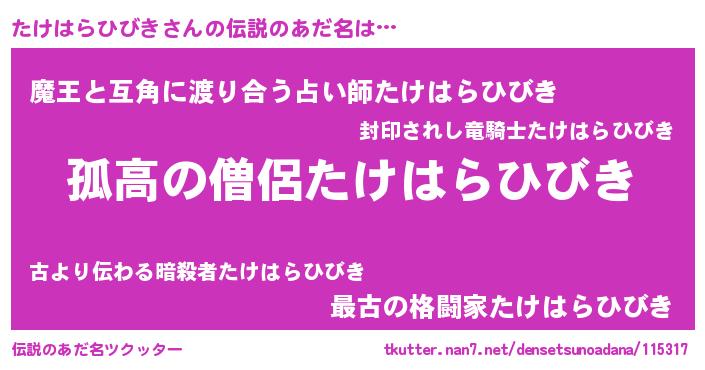 | ヒーロー風カッコイイあだ名 | 『暗黒騎士タケ』『ネオタケハラヒビキ』 |