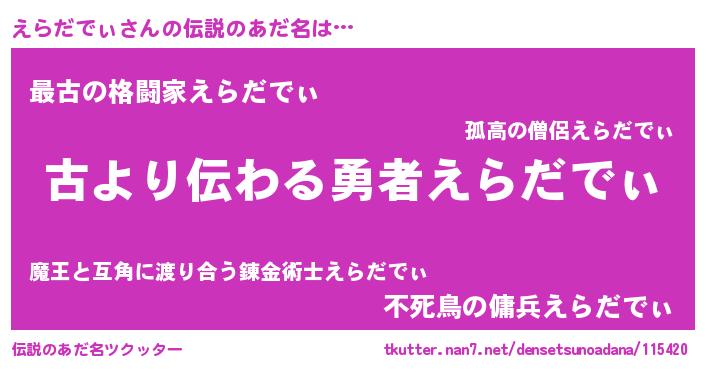 | 意味不明あだ名 | 『住所不定無職えらだでぃ(71歳)』 |