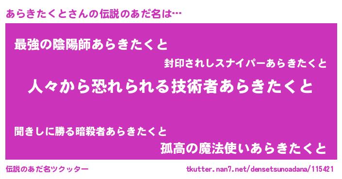 | 胡散臭い通販商品みたいなあだ名 | 『100人中100人が認めたマグネット磁石…その名も「あらきたくと」』 |