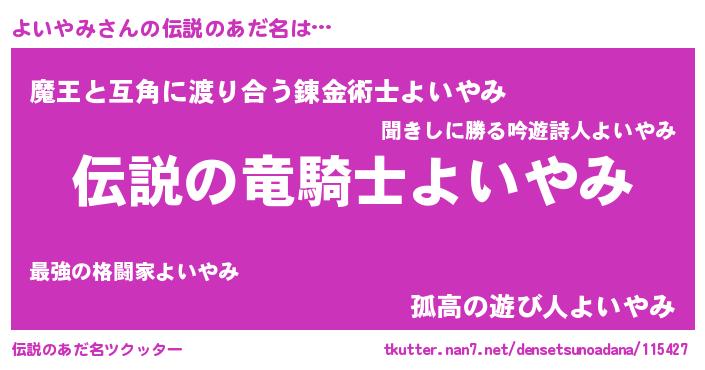 | 胡散臭い通販商品みたいなあだ名 | 『必ず成功するブレスレット…その名も「よいやみ」』 |
