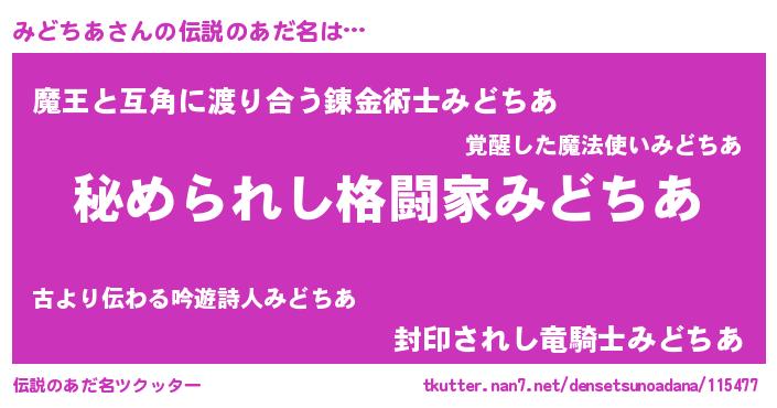 | ヒーロー風カッコイイあだ名 | 『仮面ミドダー』『ウルトラみどちあマン』 |