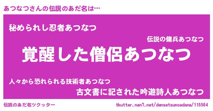| 男性向けラノベタイトル風あだ名 | 『あつなつ~年齢イコール彼女いない歴の魔法使い~』 |