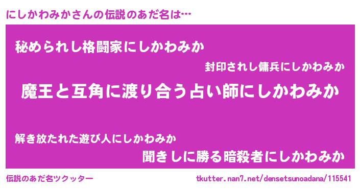 | 男性向けラノベタイトル風あだ名 | 『この素晴らしい世界ににしかわみかを!』 |