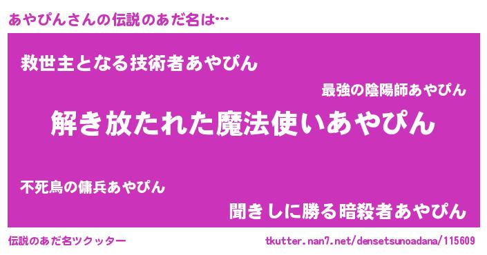 | 男性向けラノベタイトル風あだ名 | 『ダンジョンにあやぴんを求めるのは間違っているだろうか』 |