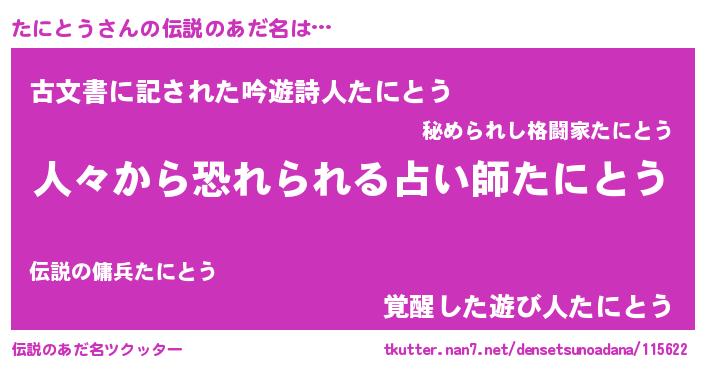 | 意味不明あだ名 | 『しいたけ科たにとう属』『自称たにとう』 |