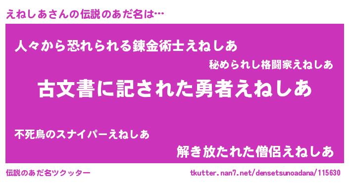 | 男性向けラノベタイトル風あだ名 | 『この素晴らしい世界にえねしあを!』 |