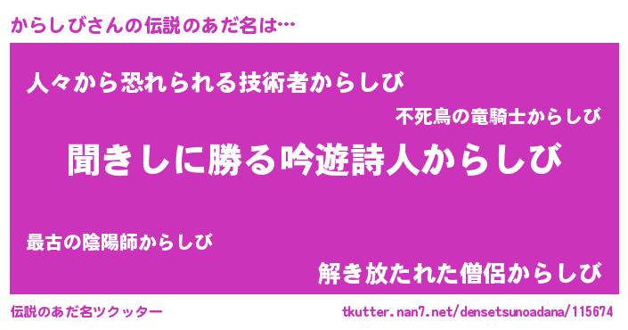 | 意味不明あだ名 | 『永久保存からしび』『自称からしび』 |