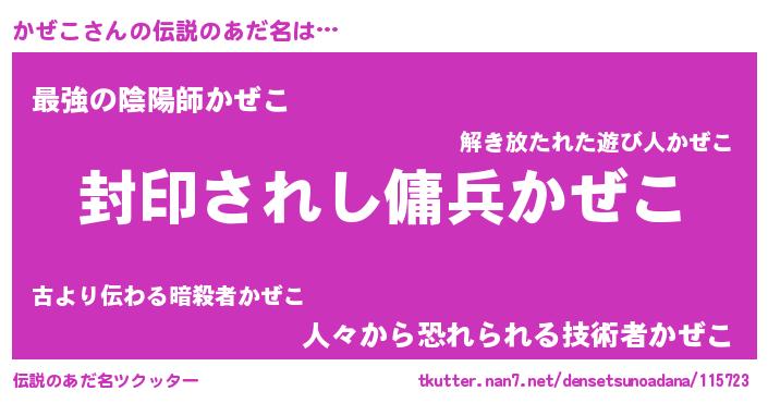 | 女子向けラノベタイトル風あだ名 | 『男装かぜこの憂鬱な任務』『闇のかぜこ』 |
