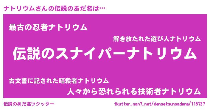 | 意味不明あだ名 | 『ペロリンナトリウム』『自称ナトリウム』 |