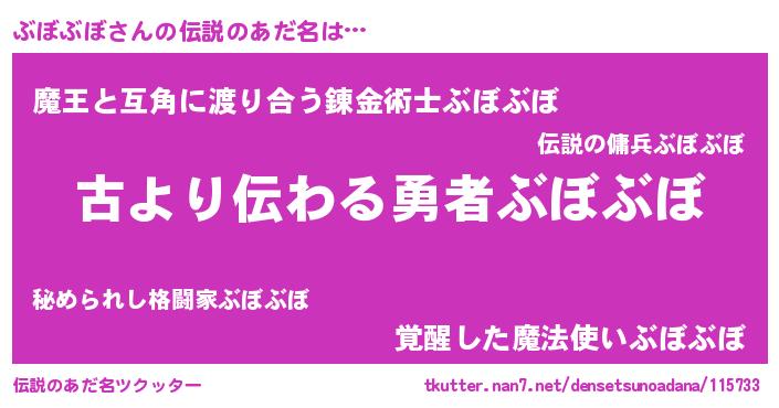 | 男性向けラノベタイトル風あだ名 | 『ぶぼぶぼという概念が存在しない退屈な世界 』 |