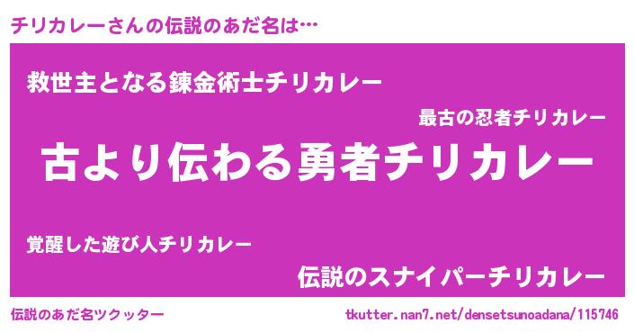 | 男性向けラノベタイトル風あだ名 | 『チリカレーという概念が存在しない退屈な世界 』 |