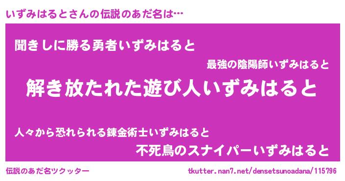 | ヒーロー風カッコイイあだ名 | 『魔戒騎士イズ』『ネオイズミハルト』 |