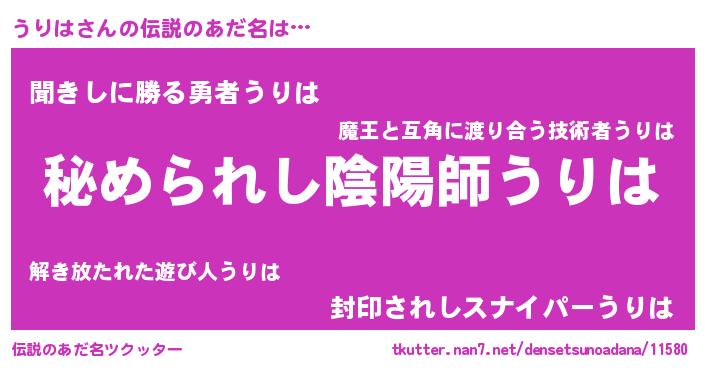| 男性向けラノベタイトル風あだ名 | 『ウリハスレイヤー』『うりはの憂鬱』 |