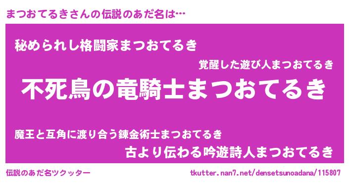 | 女子向けラノベタイトル風あだ名 | 『まつおてるき姫と円卓の騎士』 |