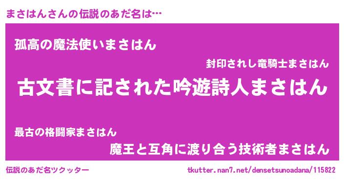 | 男性向けラノベタイトル風あだ名 | 『まさはん~年齢イコール彼女いない歴の魔法使い~』 |