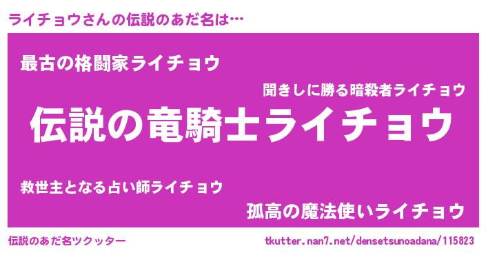 | ヒーロー風カッコイイあだ名 | 『超時空戦士ライチョウ』『黄金騎士ライ』 |