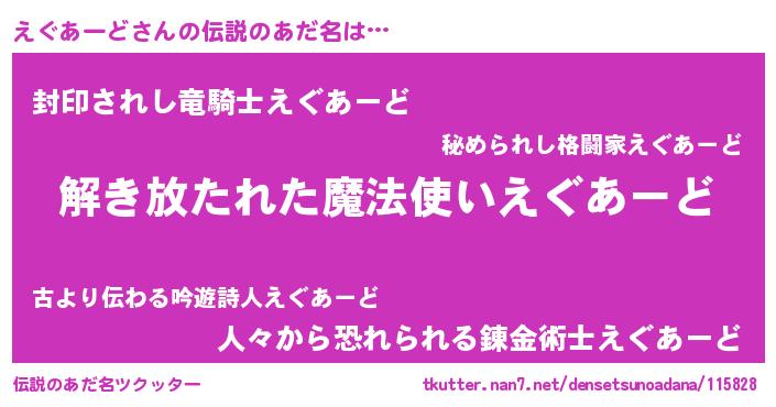 | ヒーロー風カッコイイあだ名 | 『魔戒騎士エグ』『究極戦士エグアード』 |