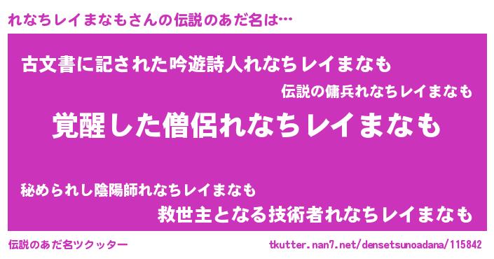 | ヒーロー風カッコイイあだ名 | 『天弓騎士レナ』『ネオレナチレイマナモ』 |