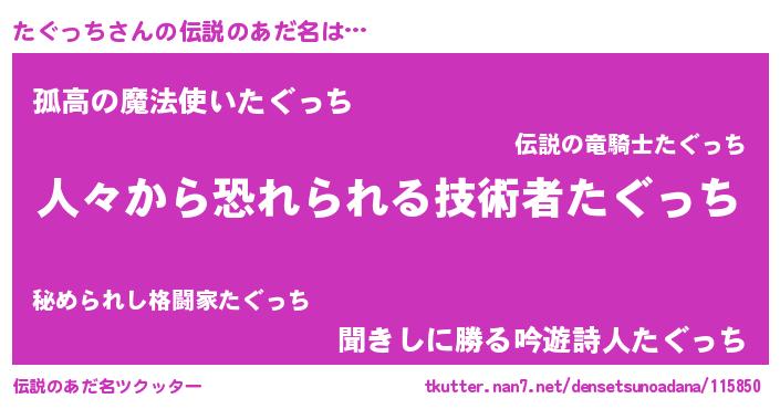 | ヘコむあだ名 | 『たぐ太郎』『たぐっち(小並感)』 |