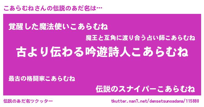 | 胡散臭い通販商品みたいなあだ名 | 『テレビで話題の高麗人参…その名も「こあらむね」』 |