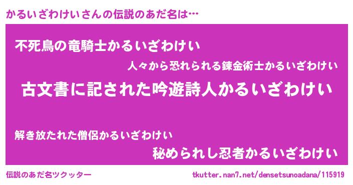 | 胡散臭い通販商品みたいなあだ名 | 『あなたにだけ特別に提供する100年もののヴィンテージワイン…その名も「かるいざわけい」』 |