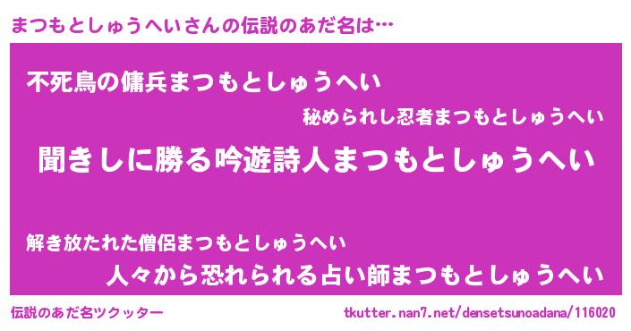 | ヘコむあだ名 | 『まつもとしゅうへい(小並感)』『まつもー』 |