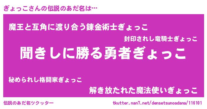 | 男性向けラノベタイトル風あだ名 | 『ぎょっこという概念が存在しない退屈な世界 』 |