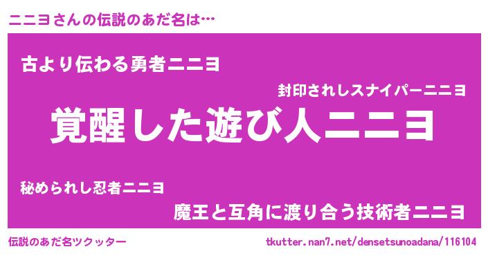 | 男性向けラノベタイトル風あだ名 | 『ニニヨの嫁は女の子じゃないと思った?』 |
