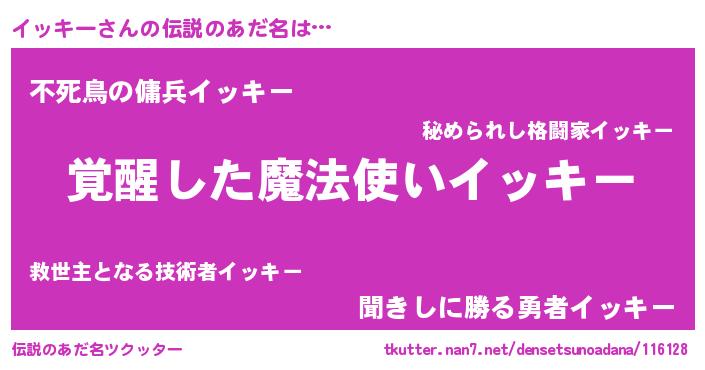 | ヒーロー風カッコイイあだ名 | 『天弓騎士イッ』『スーパーイッキー』 |