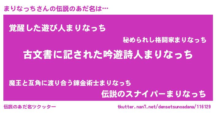 | 胡散臭い通販商品みたいなあだ名 | 『あなたにだけ特別に提供する100年もののヴィンテージワイン…その名も「まりなっち」』 |