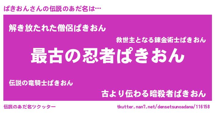 | 男性向けラノベタイトル風あだ名 | 『この素晴らしい世界にぱきおんを!』 |