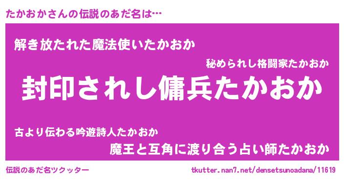 | 男性向けラノベタイトル風あだ名 | 『たかおかに滅ぼされるだけの簡単なお仕事です』 |