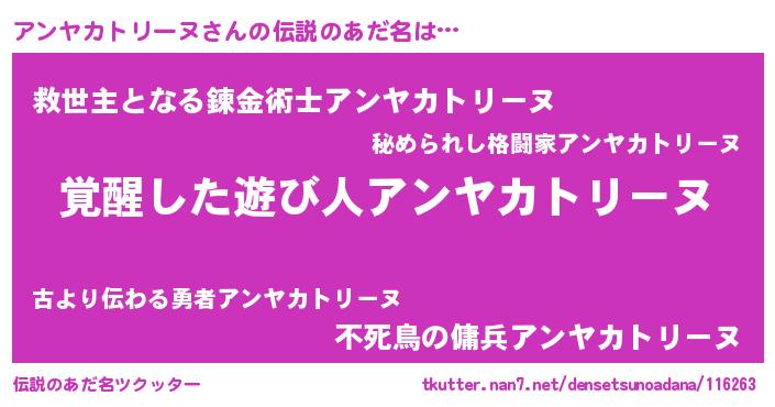 | 男性向けラノベタイトル風あだ名 | 『アンヤカトリーヌ~年齢イコール彼女いない歴の魔法使い~』 |