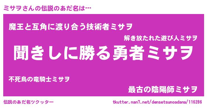 | 男性向けラノベタイトル風あだ名 | 『ミサヲスレイヤー』 |