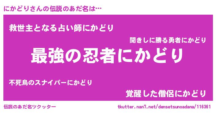 | 意味不明あだ名 | 『にかどりフォーエバー』『自称にかどり』 |