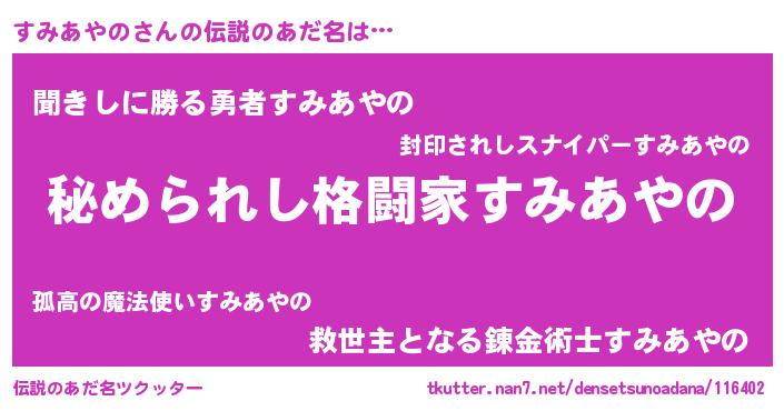 | 意味不明あだ名 | 『自称すみあやの』『ニラ科すみあやの属』 |