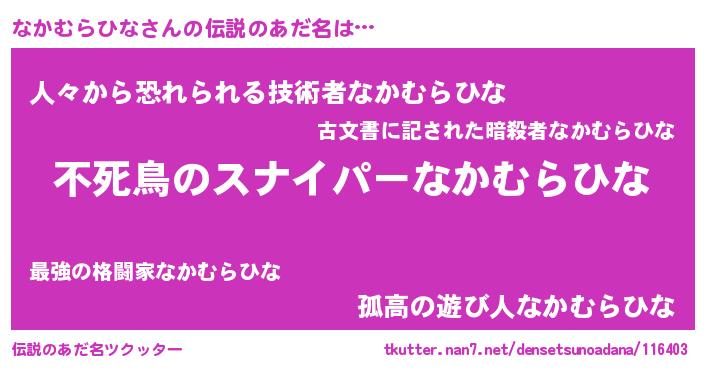 | 意味不明あだ名 | 『住所不定無職なかむらひな(77歳)』 |