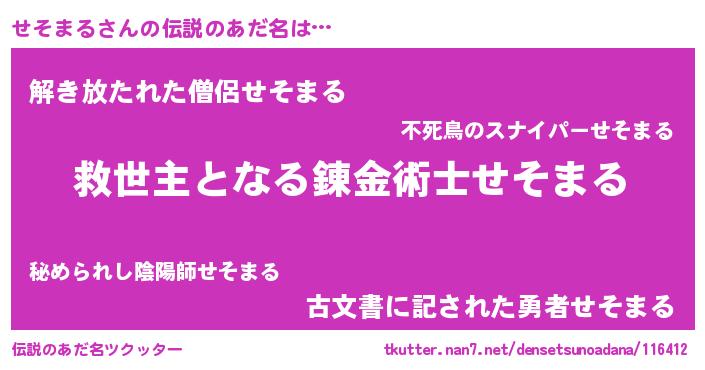 | ヘコむあだ名 | 『せそぷりん』『せそまる(苦笑)』 |