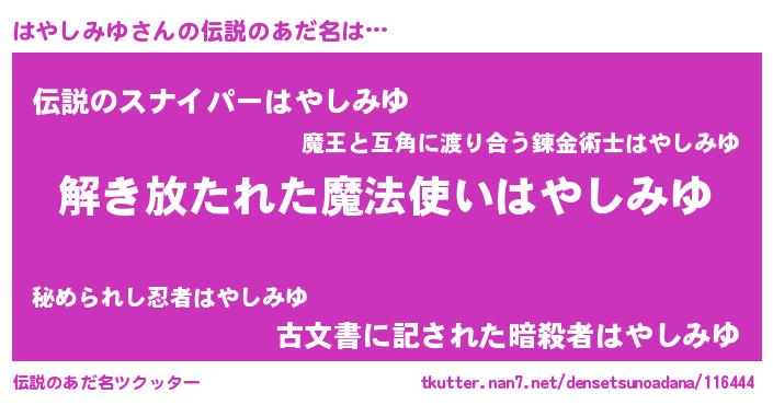 | 意味不明あだ名 | 『住所不定無職はやしみゆ(7歳)』 |