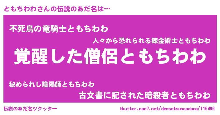 | 男性向けラノベタイトル風あだ名 | 『ともちわわに滅ぼされるだけの簡単なお仕事です』 |