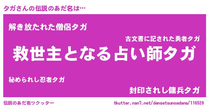 | 男性向けラノベタイトル風あだ名 | 『タガに滅ぼされるだけの簡単なお仕事です』 |