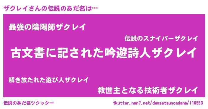 | 意味不明あだ名 | 『永久保存ザクレイ』『自称ザクレイ』 |