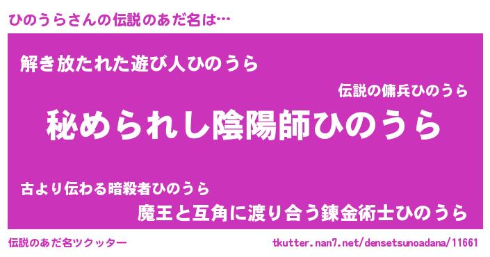 | ヒーロー風カッコイイあだ名 | 『超時空戦士ヒノウラ』『炎刃騎士ヒノ』 |