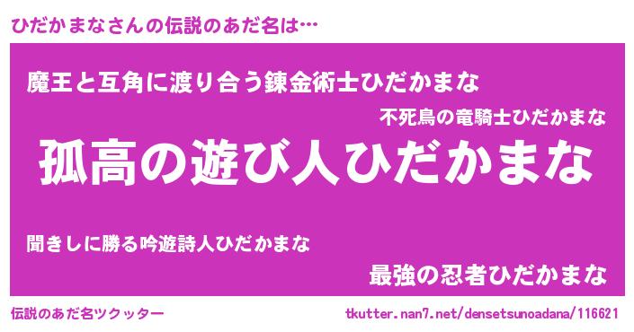 | ヒーロー風カッコイイあだ名 | 『黄金騎士ヒダ』『愛の使者ひだかまな』 |