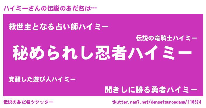 | ヒーロー風カッコイイあだ名 | 『ウルトラハイミーマン』『ネオハイミー』 |