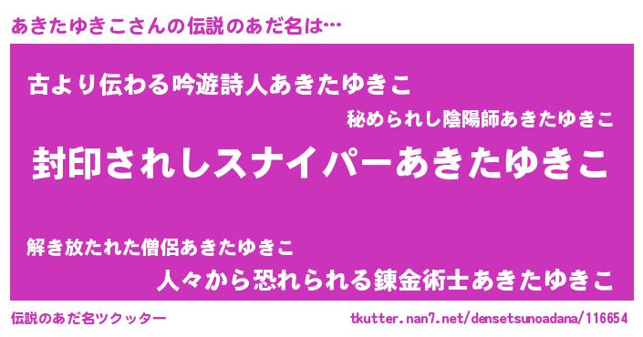 | 男性向けラノベタイトル風あだ名 | 『アキタユキコアートオンライン』 |