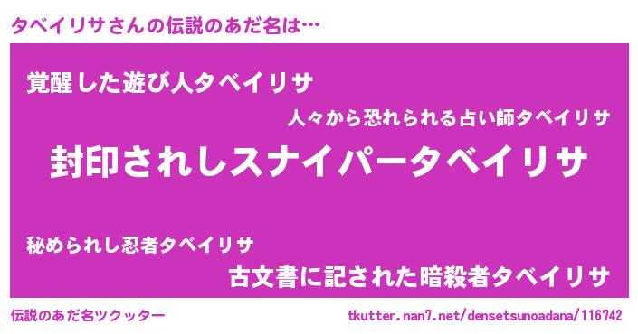 | ヒーロー風カッコイイあだ名 | 『スーパータベイリサ』『天弓騎士タベ』 |