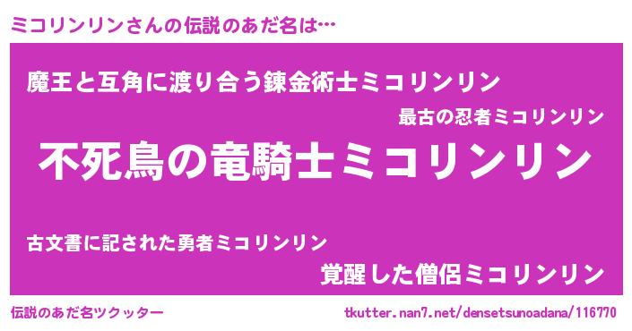 | 女子向けラノベタイトル風あだ名 | 『ミコリンリン姫と円卓の騎士』 |